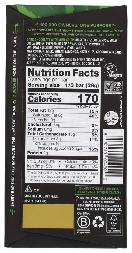 DIVINE CHOCOLATE Chocolate, 70% Dark Chocolate with Mint Crisp, 3 Oz pack of 12
