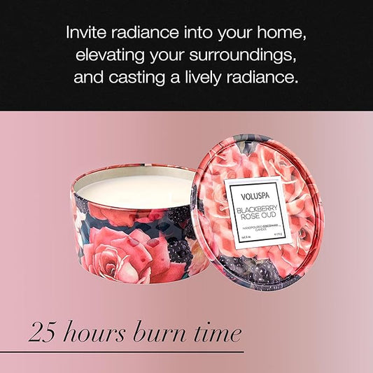 Voluspa BlackBerry Rose Oud, 2 Wick Tin Candle, 8 oz, 25 Hour Burn Time, Coconut Wax for Clean Burning, Handcrafted in The USA
