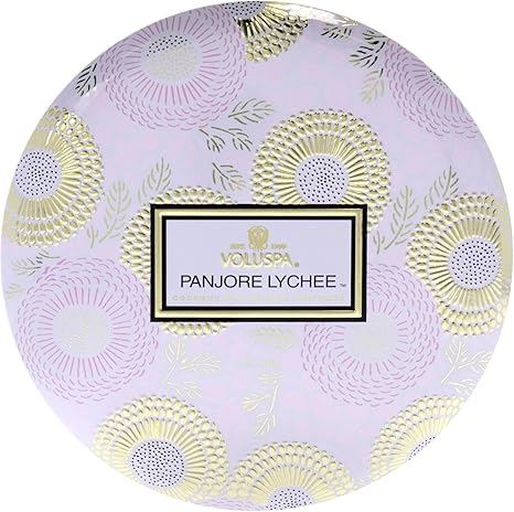 Voluspa Panjore Lychee, 3 Wick Tin Candle, 12 ounce, 40 Hour Burn Time, Coconut Wax for Clean Burning, Handcrafted in the USA
