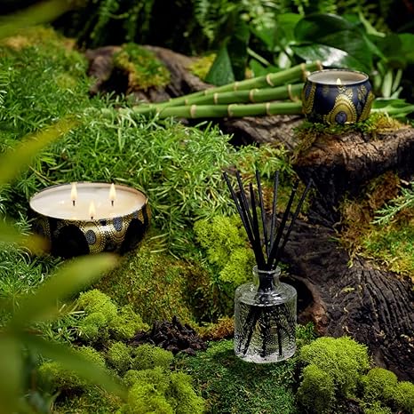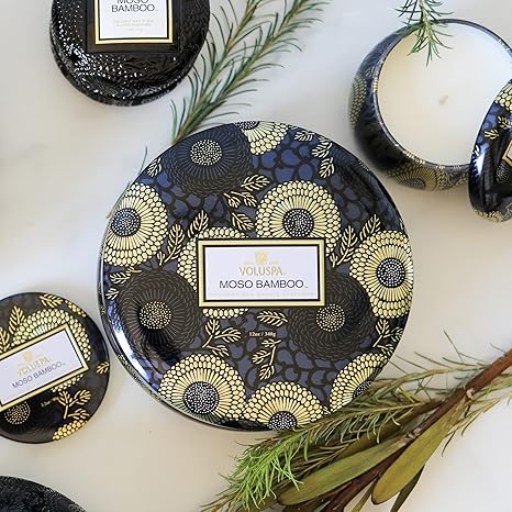 Voluspa Moso Bamboo, 3 Wick Tin Candle, 12 oz, 40 Hour Burn Time, Coconut Wax for Clean Burning, Handcrafted in the USA