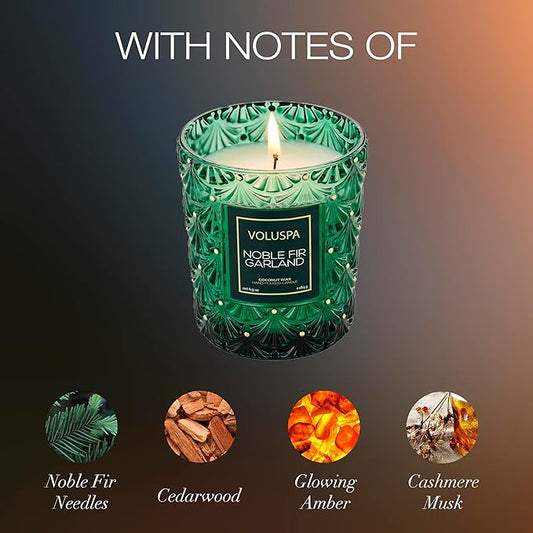 Voluspa Noble Fir Garland Boxed Candle, 6.5 oz, Coconut Wax Blend, Christmas Scented Candles for Home, 40 Hour Burn Time, Handcrafted in The USA