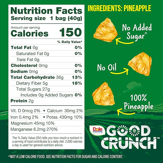 Dole Good Crunch Pineapple Bites deliver authentic tropical flavor in a convenient, portable format. Each 1.4 oz bite combines freeze-dried pineapple with a satisfying crunch, preserving the fruit's natural sweetness and vibrant taste. This six-pack offers an ideal solution for on-the-go snacking, lunch boxes, or quick energy boosts throughout your day. No artificial flavors or added sugars compromise the pure pineapple experience. Perfect for health-conscious consumers seeking wholesome fruit snacks without compromise.