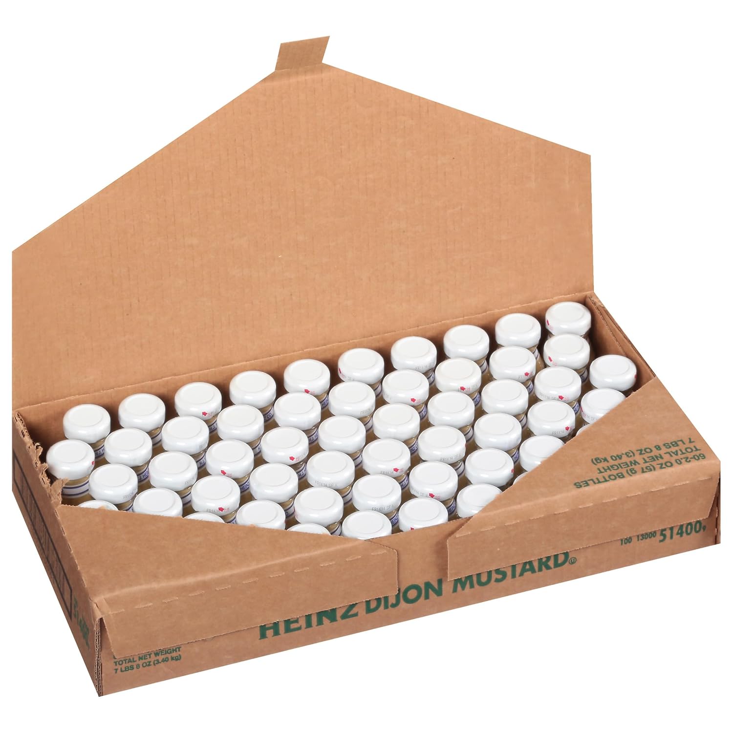 Heinz Dijon Mustard delivers classic French-style flavor in convenient single-serve portions. Each 2oz jar provides the perfect amount for sandwiches, charcuterie boards, or culinary applications without excess. This case pack of 60 units is ideal for hospitality operations, catering services, and food establishments seeking consistent quality and portion control. The distinctive tangy profile and smooth texture complement meats, cheeses, and gourmet preparations. Individually packaged jars maintain freshness and offer guests a premium condiment experience. Stock this professional-grade mustard for reliable service and customer satisfaction.