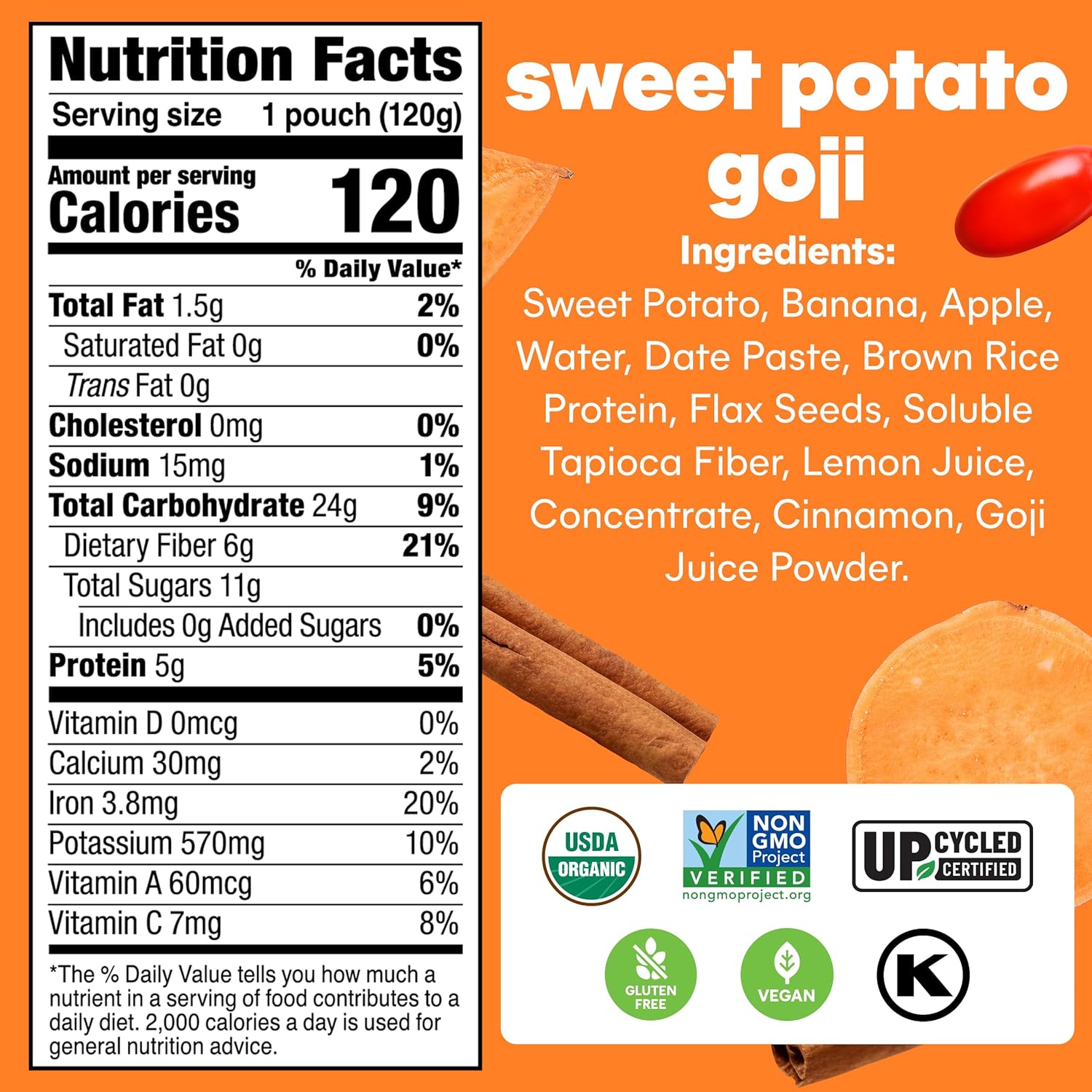 Noka Superfood Fruit Smoothie Pouches, Sweet Potato Goji, Healthy Snacks with Flax Seed, Plant Protein and Prebiotic Fiber, Vegan and Gluten Free Snacks, Organic Squeeze Pouch, 4.22 oz, 6 Co