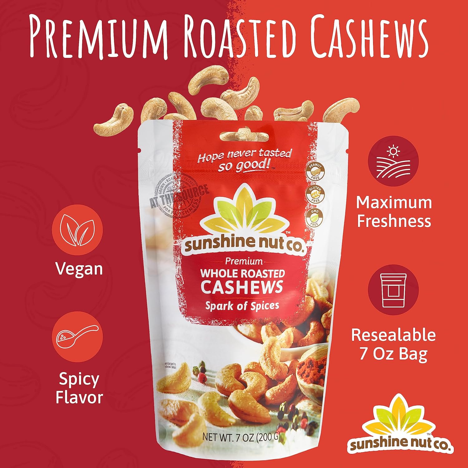 - SPICED WHOLE ROASTED CASHEWS Roasted whole in sunflower oil, enjoy the fiery flavor of fresh cashews and simmering spices – as crunchy and nutty as ever. Our delicious cashews are a special roasted treat for any savory nut-lover out there.