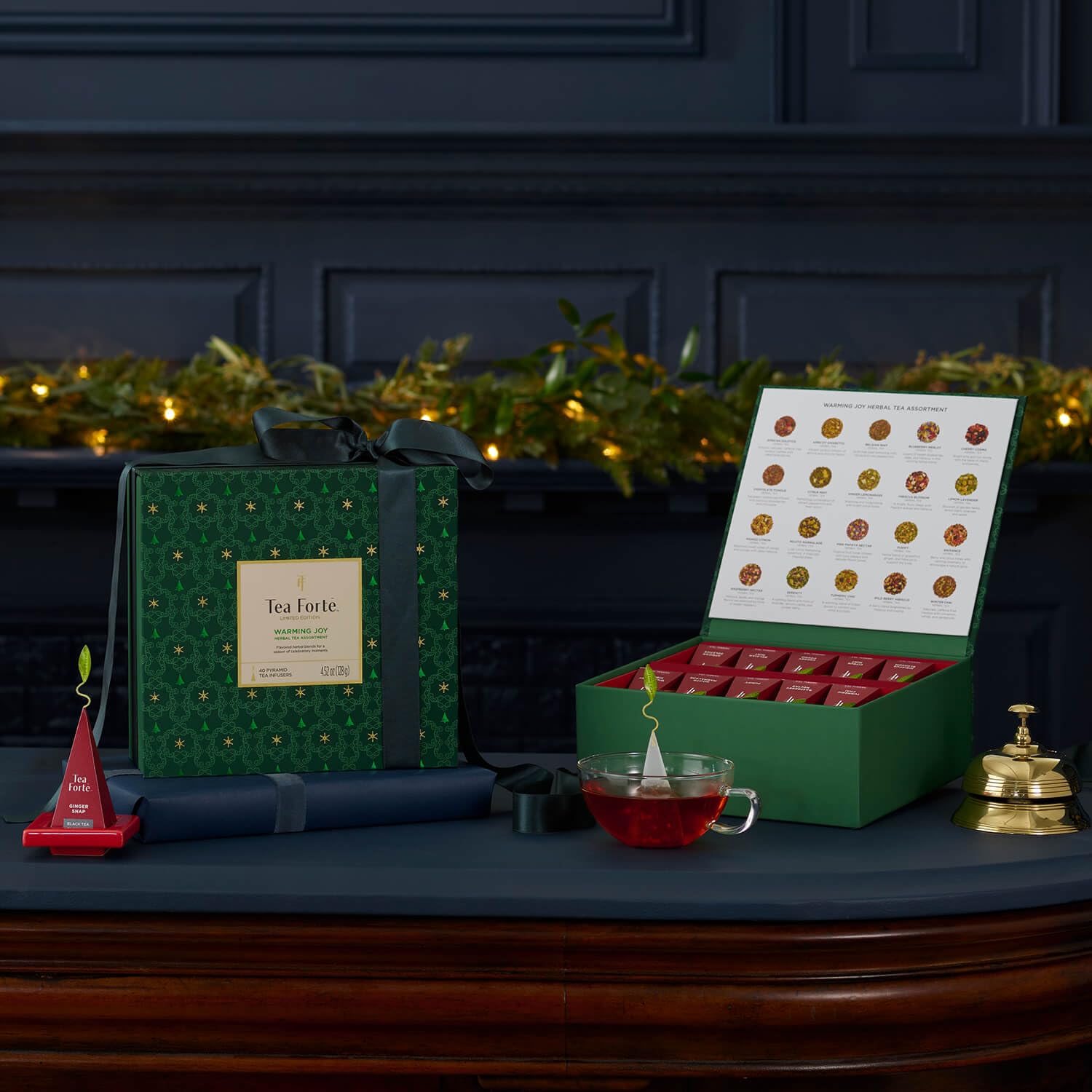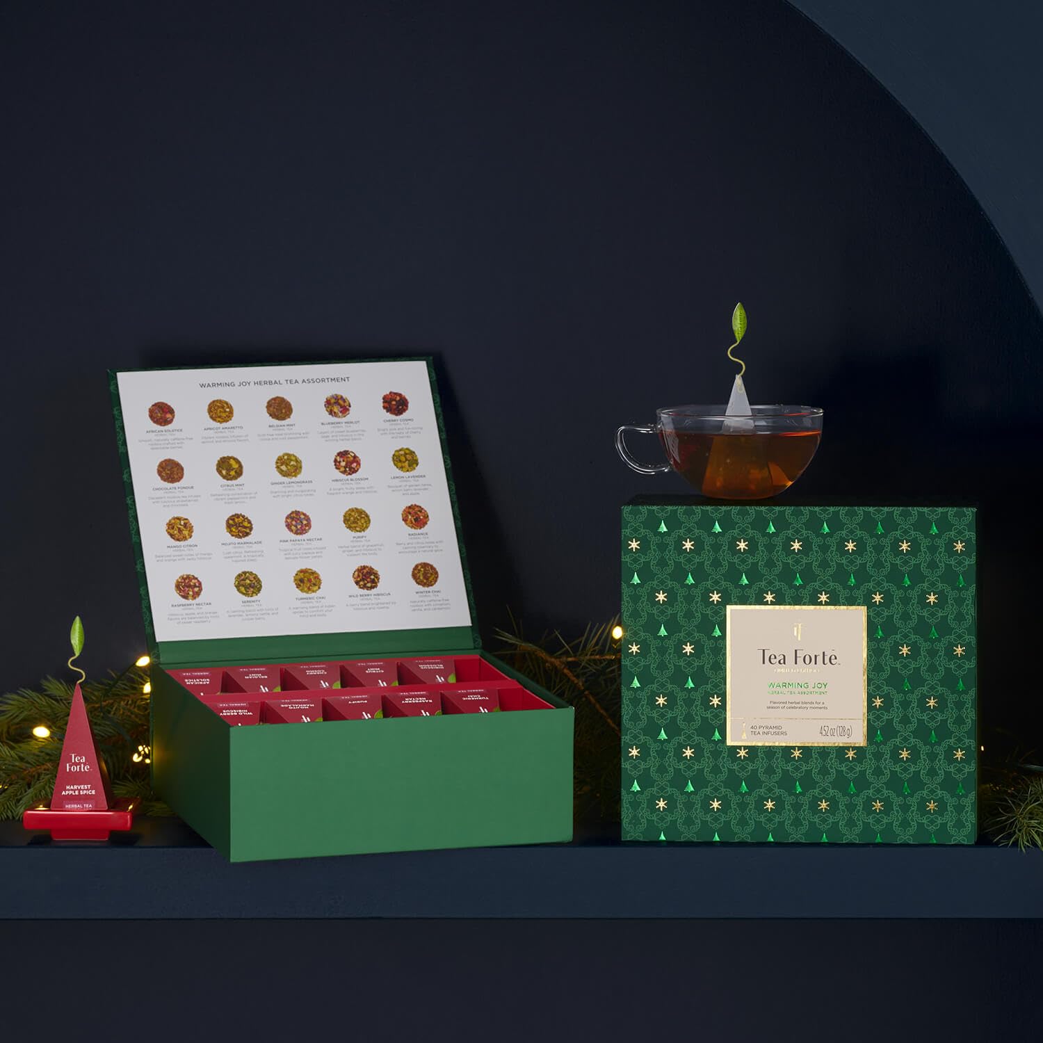 Discover the essence of seasonal comfort with Tea Forte's Warming Joy Holiday collection. This premium gift sampler features 40 individually wrapped pyramid infuser bags—two of each of 20 distinct herbal blends—crafted to deliver exceptional flavor and aroma. Each handcrafted pyramid bag unfolds fully in hot water, allowing premium botanicals to steep perfectly. Ideal for holiday gifting or personal indulgence, this curated selection showcases expertly balanced herbal varieties designed to warm and soothe throughout the season. Experience tea craftsmanship at its finest.
