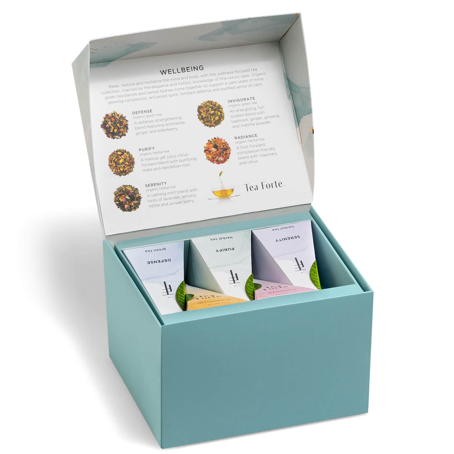 Elevate wellness with the Tea Forte WellBeing Tea Gift Set, thoughtfully curated to promote balance and relaxation. This set features a selection of premium, hand-crafted teas known for their soothing and revitalizing properties. Expertly blended with natural herbs and botanicals, each tea supports mindfulness and overall well-being, making it an ideal choice for self-care or a refined gift. Experience a harmonious ritual that nurtures both body and mind through exceptional quality and flavor.