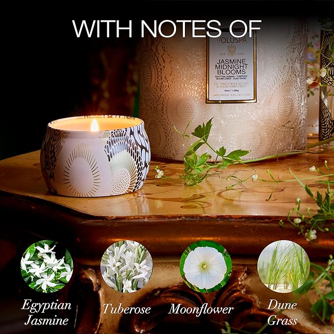 - Versatile Gift: Send this mini Jasmine Midnight Blooms scented candle tin to family, friends or yourself; these luxury candles jars are the perfect gift for anniversaries, birthdays, housewarmings, and more